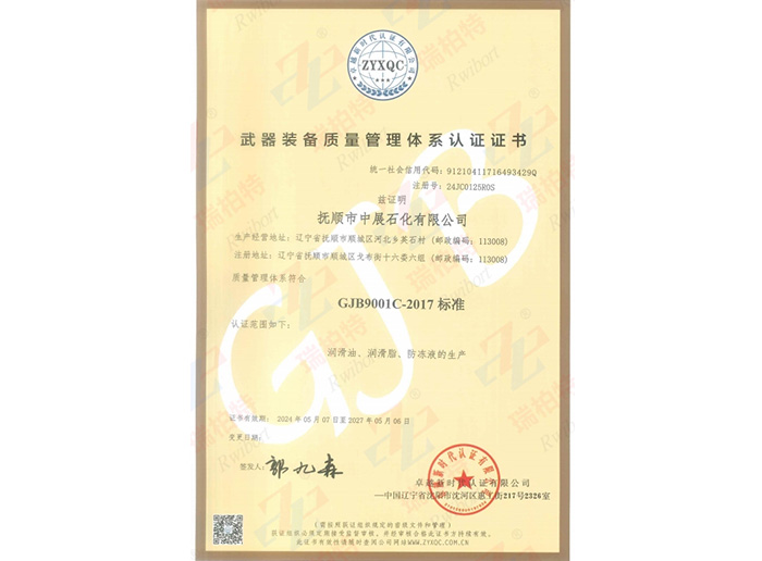 本公司是GB/T19001-2016/ISO 9001:2015標準質量體系認證單位(注冊號:00922Q10664R1S),是GJB9001C-2017標準武器裝備質量管理體系認證單位。撫順在上個世際五十年代就已是我國軍用油脂的生產基地,本公司正在發揚和繼承這一優良傳統,全力投入于各種軍用、航空油脂的生產與研發。